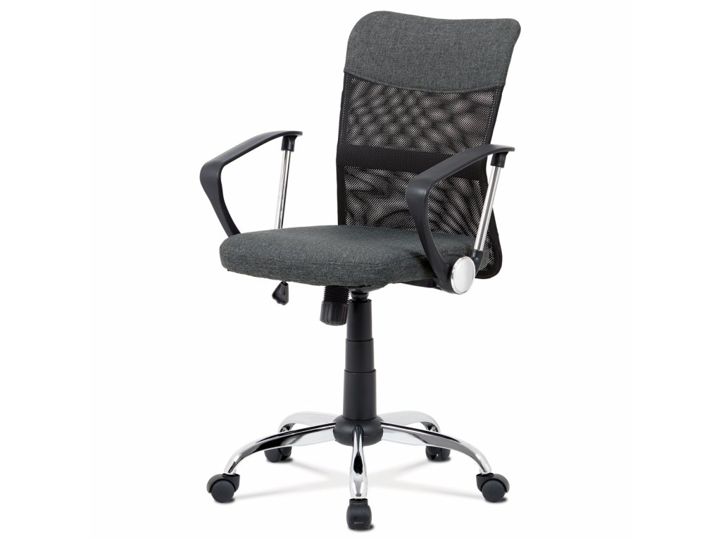Kancelářská židle řady Basic nejen pro juniorské businessmany. Potah je z tmavě šedé jemně hrubé látky v kombinaci s černou síťovinou MESH. Výplň je z kvalitní PU pěny. Židle je vybavena houpacím mechanismem s nastavením protiváhy a aretací v základní poloze. Tuhost protiváhy lze regulovat velkým plastovým šroubem, umístěným pod sedákem. Výška sezení se upravuje páčkou na pravé straně přes kvalitní plynový píst. Područky jsou černé plastové s kovovými chromovými vzpěrami. Šíře područek je 5 cm, délka ložné plochy je 34 cm, což je zcela dostačující pro pohodlné opření rukou. Kovový kříž je o průměru 58 cm s chromovou povrchovou úpravou. Kolečka jsou plastová, určená na koberce. Opěrák má kovovou konstrukci, je ergonomicky tvarovaný a dokonale prodyšný, což oceníte v horkých dnech nebo při dlouhém sezení. Nosnost židle je až 100 kg.